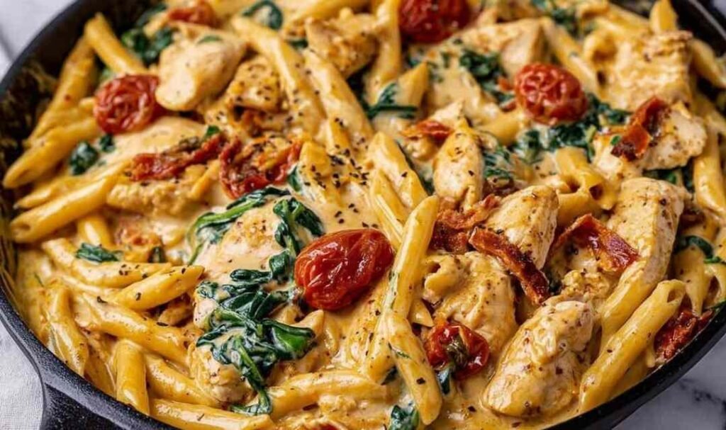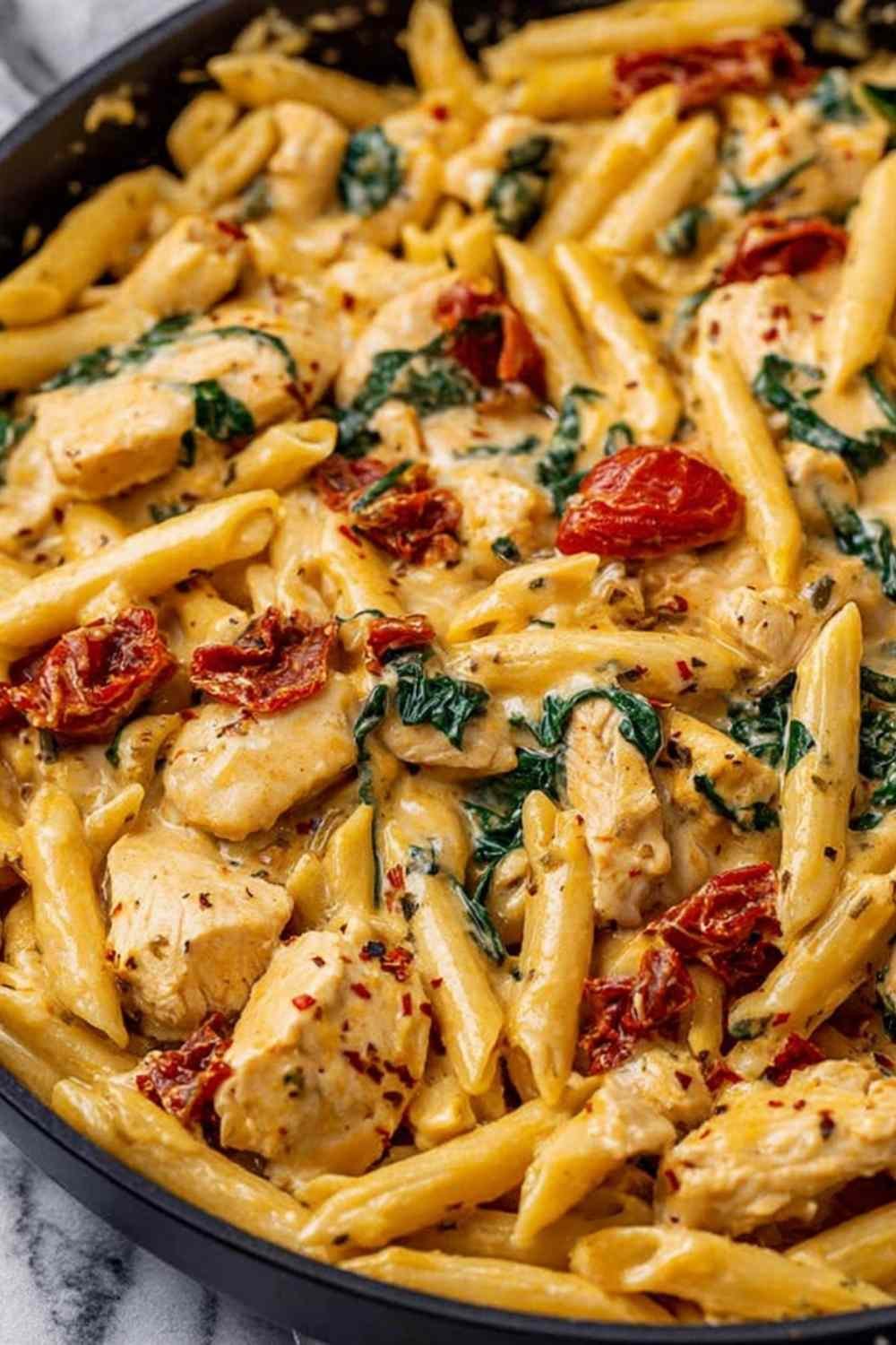 The combination of tender chicken, penne pasta, and that rich parmesan cream sauce with sun-dried tomatoes is hard to beat. The sauce is silky, bold, and full of Mediterranean flavor without requiring any fancy technique. One skillet, one pot for the pasta, and dinner is done.